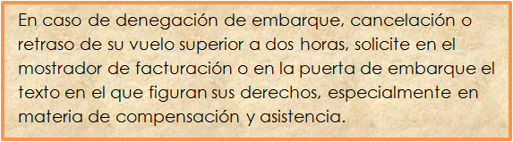 - Derecho de información: La compañía aérea debe ofrecerte un impreso donde figuren las normas en materia de compensación por overbooking y asistencia.